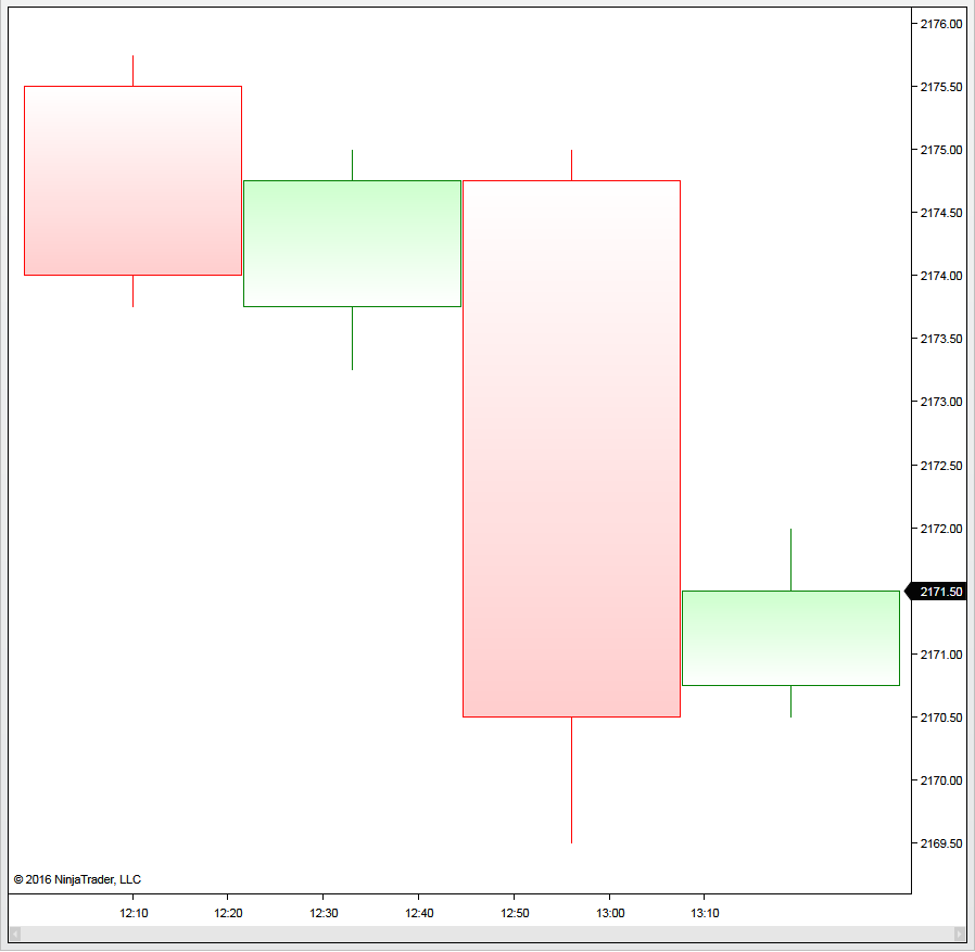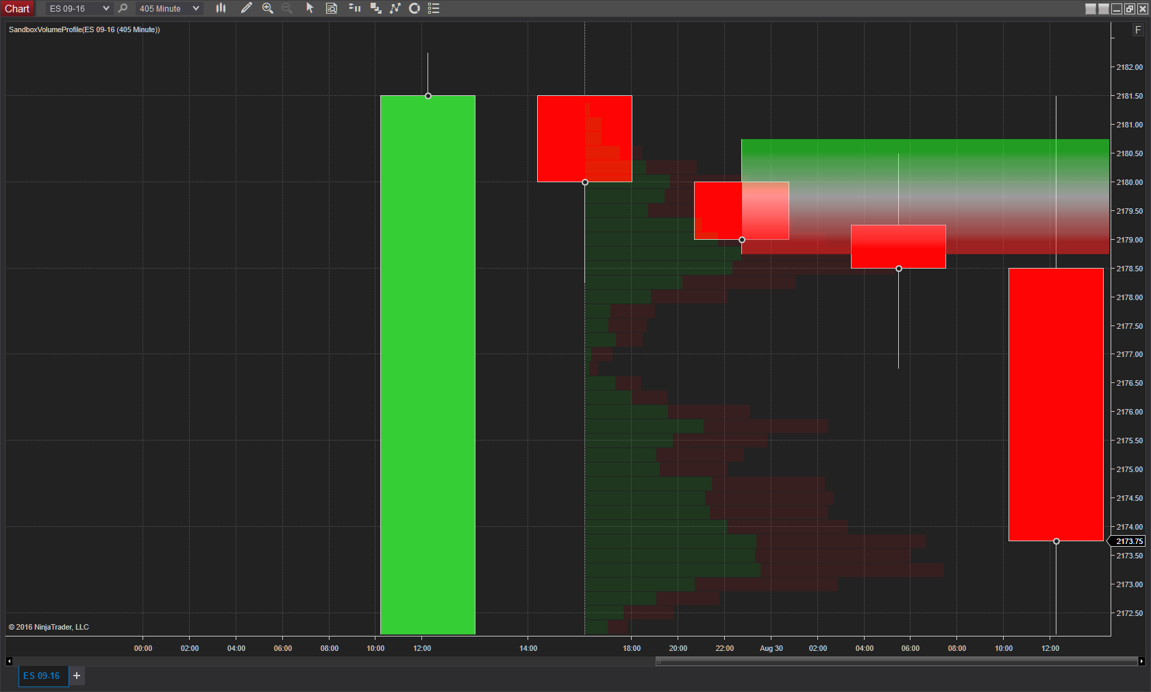 In the jagged gradient, there are two rectangles. For example, in the 13:03 bar, the top rectangle is between 2170.50 and 2171.00 and the bottom rectangle is between 2170.50 and 2170.00. The top gradient should be from white to green, while the bottom one should be from white to red.Originally posted by NinjaTrader_Jesse View PostIs this one rectangle being colored or multiple rectangles in this image?