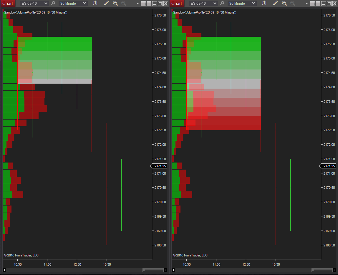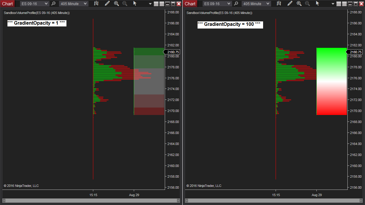 Here you go. It's a clone of your VolumeProfile indicator with gradient highlighting added that demonstrates both the "jagged" and "obscuring" issues.Originally posted by NinjaTrader_Jesse View PostIf you could provide a sample that demonstrates drawing a single rectangle along with 1 gradient that shows this would be sufficient. I would not need to see any other logic in the current script so a new sample with only the drawing would be suggested.