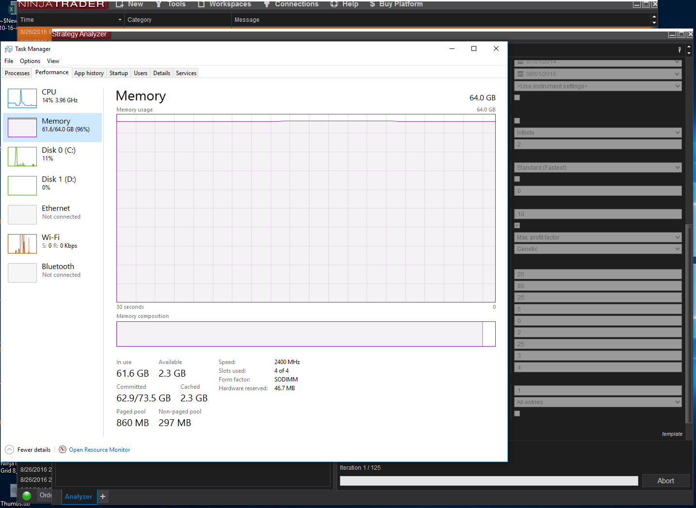 Thanks Brett, I was thinking the same thing. It seems like if the memory issue is resolved it will also resolve the slow load times for the optimizer. I haven't seen any comments over on the other thread yet today, but I will be watching for what NT would like to do next.Originally posted by NinjaTrader_Brett View PostThe ram issue and the long initialization time likely is all in the same. Since if that much RAM has to be allocated (and NT7 doesn't allocate the same) then for sure it will be slower. The key here is understanding why all the RAM in the system is being used. Once we isolate that then this would be likely be solved. Therefore I feel we should hold off and wait for conclusion on the RAM usage thread before picking up on this.