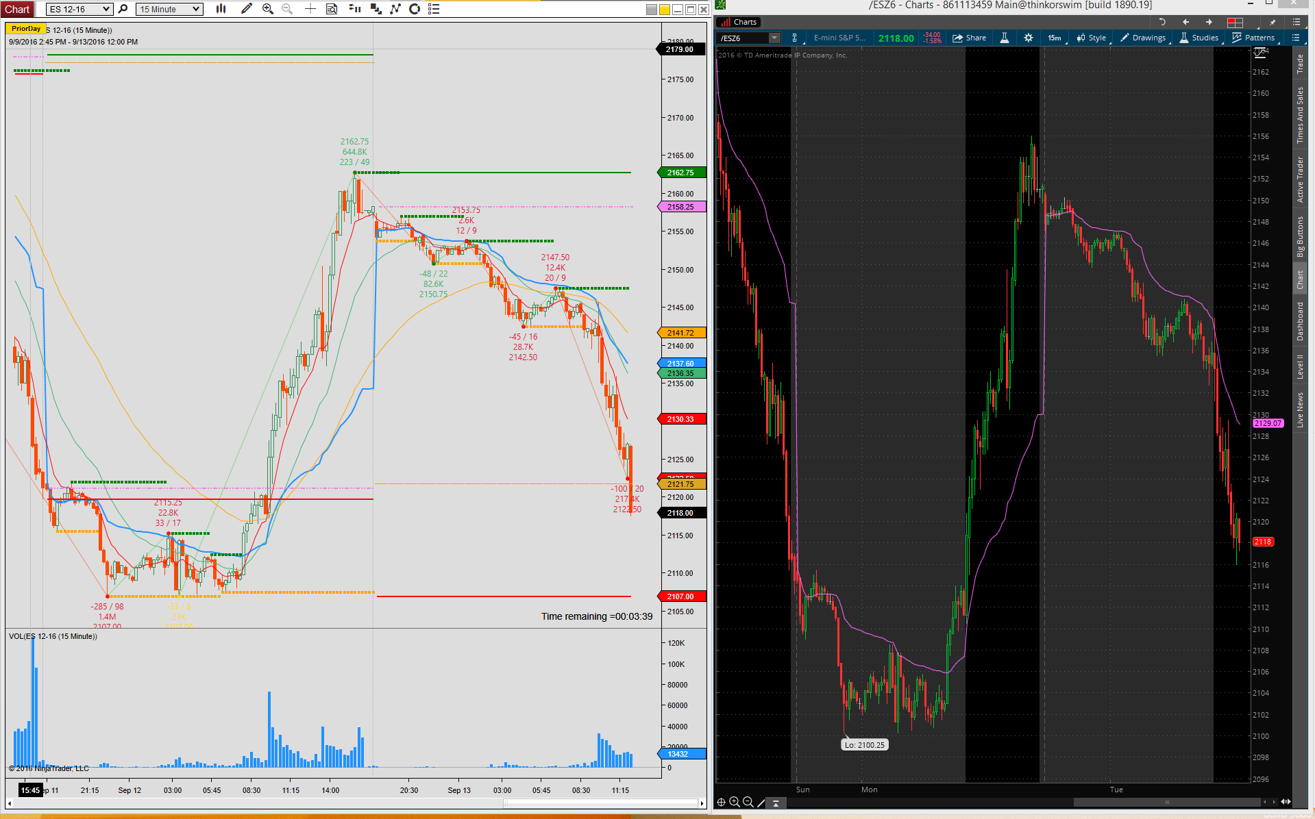 ES chart with Rithmic out on lunch...