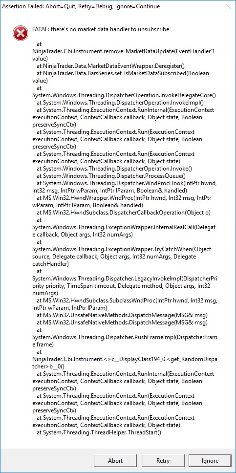 The first time I got the error I had successfully brought up the chart but the Trading hours were not what I wanted so I changed them and that was the first time I got the error. After that, it happened repeatedly until I stopped NT 8.