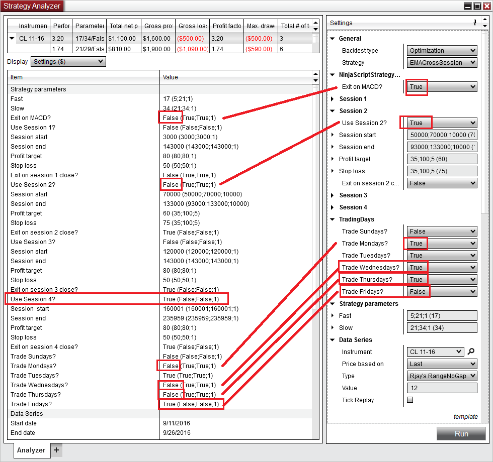 But guess what you get?? It blows off Session 2 and optimizes Session 4 instead. You'll note that I have Session 4 set to false which means do not optimize. I don't have it set to true or Optimize. I have it set to false. Not only that, I only want to optimize Mondays, Tuesdays, Wednesdays and Thursdays - those are set to True. Sundays and Fridays are set to False, meaning don't optimize on Fridays and Sundays. It decided I should optimize on Fridays, but not on Mondays, Wednesdays or Thursdays. The screen shots shows you what I'm talking about. The first one shows you that it's optimizing on whatever it wants to and the second one shows you that it's serious about optimizing on whatever it wants to. It decided to optimize on the settings for Session 4 and that's exactly what it did. (As opposed to really optimizing on what you wanted and the results are wrong. Nope - the results are properly reflected in the chart.)