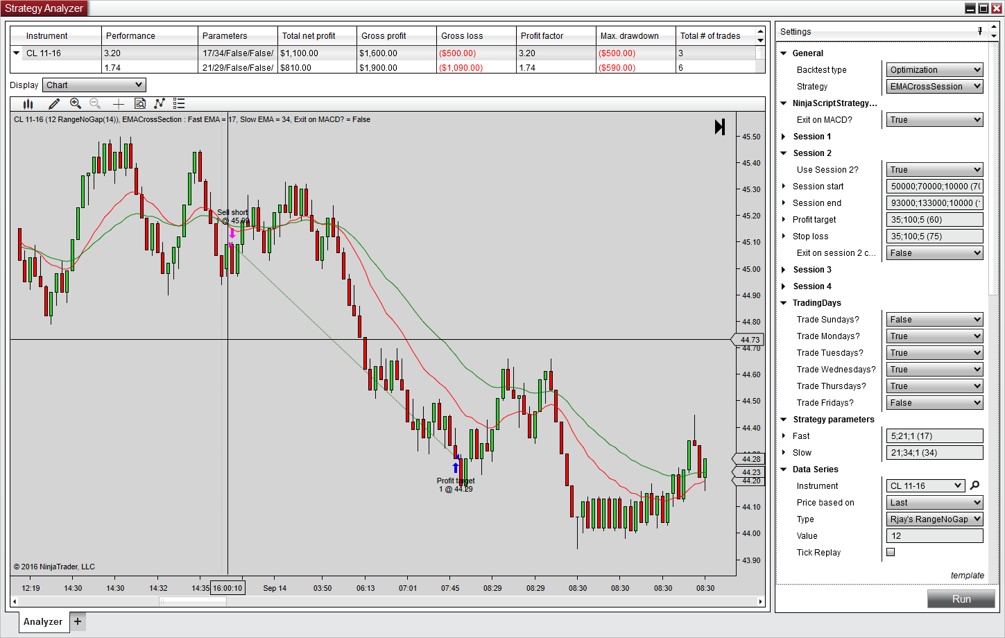 This is the same strategy that has the four trading sessions. I have it set to optimize between 5:00 am 7:00 am to 9:30 am to 1:30 pm with various stops and targets. I don't have Exit on Close 2 set because of the crash bug that happens when I want to run a secondary series in the background, which right now you unfortunately can't do so I didn't even implement that.