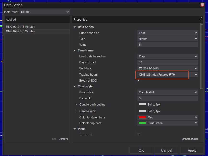 The data series is using CME US Index Futures RTH as the Trading Hours template, and my timezone is set to Pacific time. I restarted the platform after I changed my timezone.