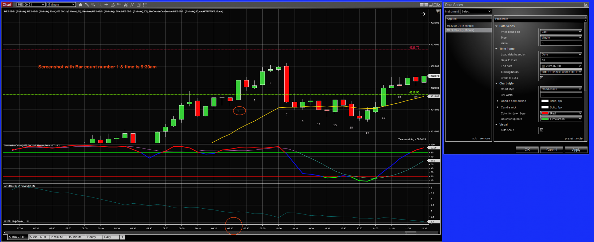 Or, if you want to see the extended hours but only count the regular trading hours, you can add a second data series to the chart of the very same instrument and bars and put them in the same panel, and on the added series change the trading hours to the regular trading hours, finally assign the indicators input series to the added data series. I've attached an example of what this would look like with today's data on ES 09-21: Note that my chart is on Mountain time so Market Open of regular trading hours is 7:30 AM on the chart