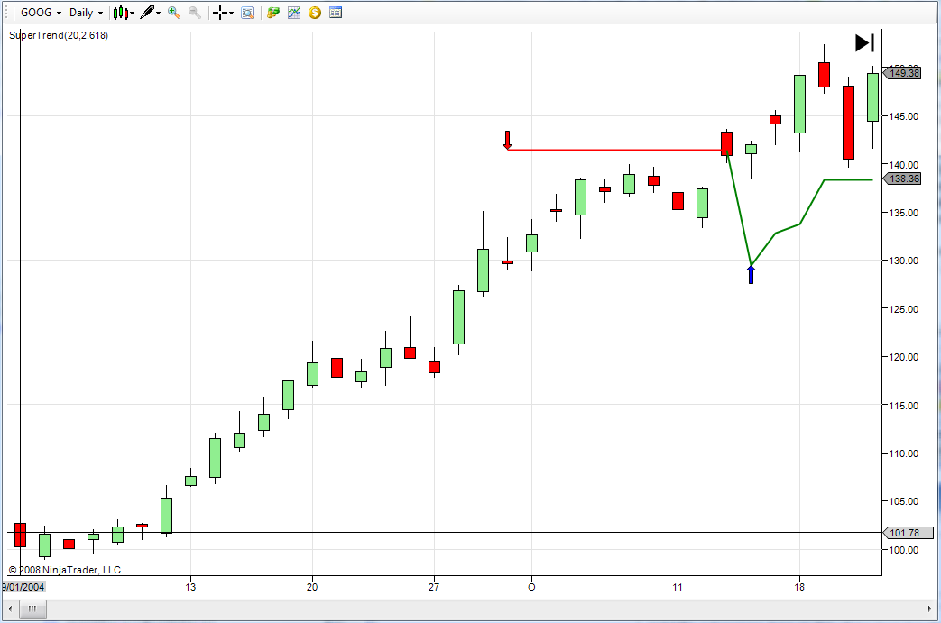 I just tried version 1.7 and I think it has the same issue I mentioned in my previous message. Attached is a screenshot of daily bars for GOOG starting 9/1/2004 with the shown SuperTrend parameters (length=20). It looks like the initial trend indicator before the first crossover is set based on the first bar after the length number of bars, even if that single bar isn't indicative of the general trend at that point. Maybe someone else has a better idea, but my suggestion is to set the initial trend to be up or down based on comparing the first bar after the ATR period length number of bars to the very first bar in the chart. In the case, the first bar closes way below the 21st bar, so the initial trend would be up rather than the current down trend it currently gets from the single 21st bar.Last edited by Anagoge; 12-10-2008, 12:04 AM.