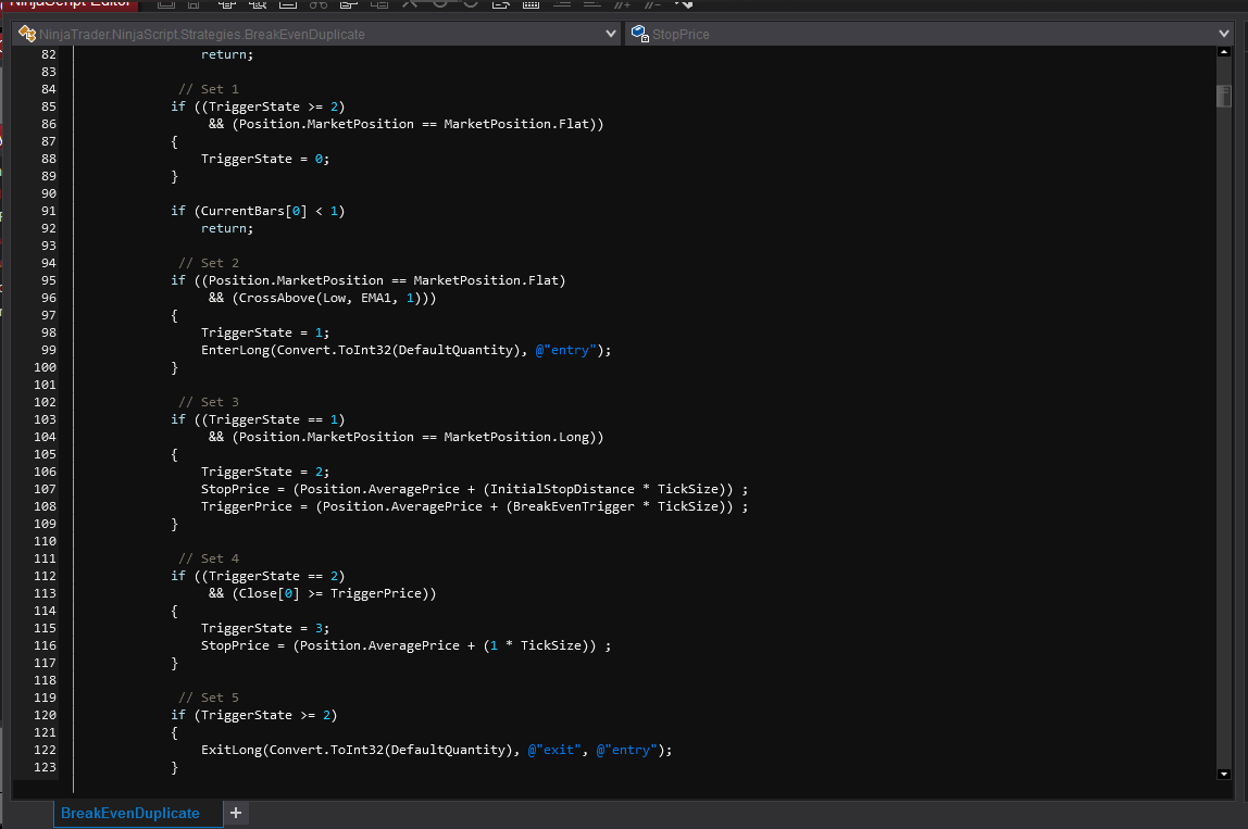 In Set 4 I have for breakeven+1, StopPrice = (Position.AveragePrice + (1 * TickSize));