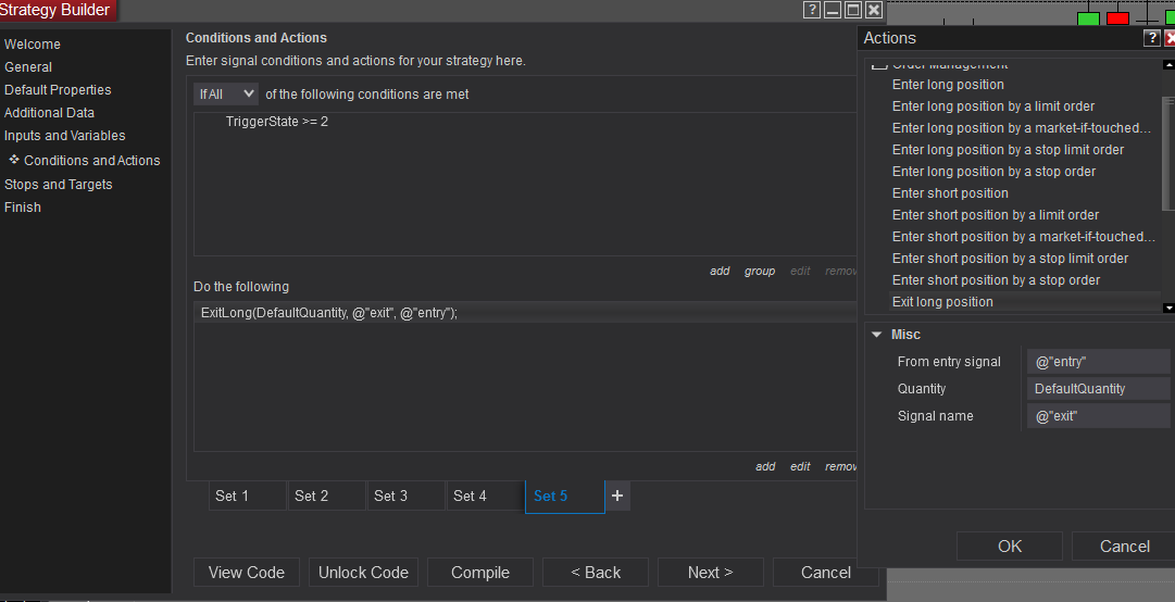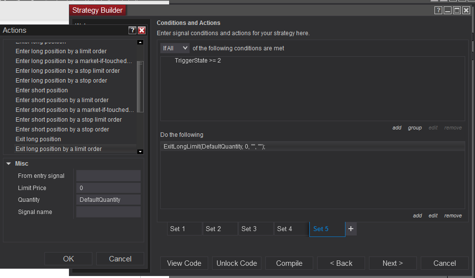 Hi, thanks for your reply. You can export scripts through Tools>Export>NinjaScript Addon. No need though, I can see the issue from your screen shot. The Set 5 is submitting a market order so you should set that to ExitLongLimit() instead and specify a price above the AverageEntry/Latest Close price.