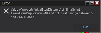 Hi trdninstyle, thanks for your reply. The "InitialStopDistance" variable is set to -40 by default when the minimum is defined as 5. The ExitLongLimit price you have posted here will place the order 40 ticks above the average entry price.