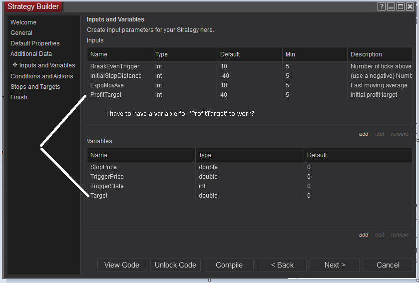 The other one then, yes, I do need to have a variable to go with my profit target in the inputs & variable, otherwise it won't work. I'm gathering that answer.