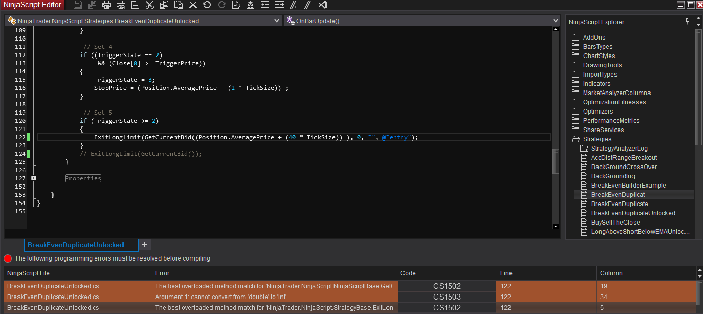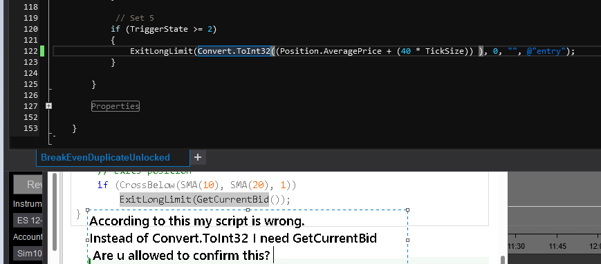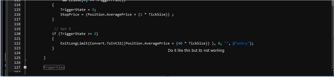 3rd pic I have it like this. ExitLongLimit(Convert.ToInt32((Position.AveragePri ce + (40 * TickSize)) ), 0, "", @"entry");