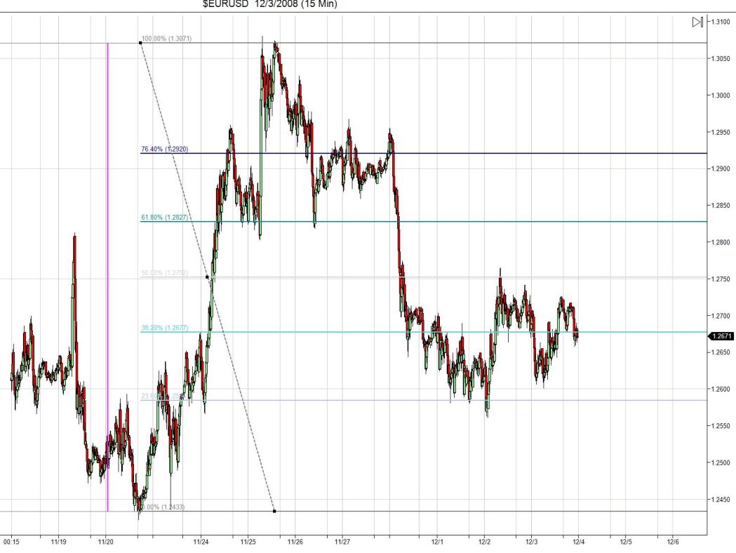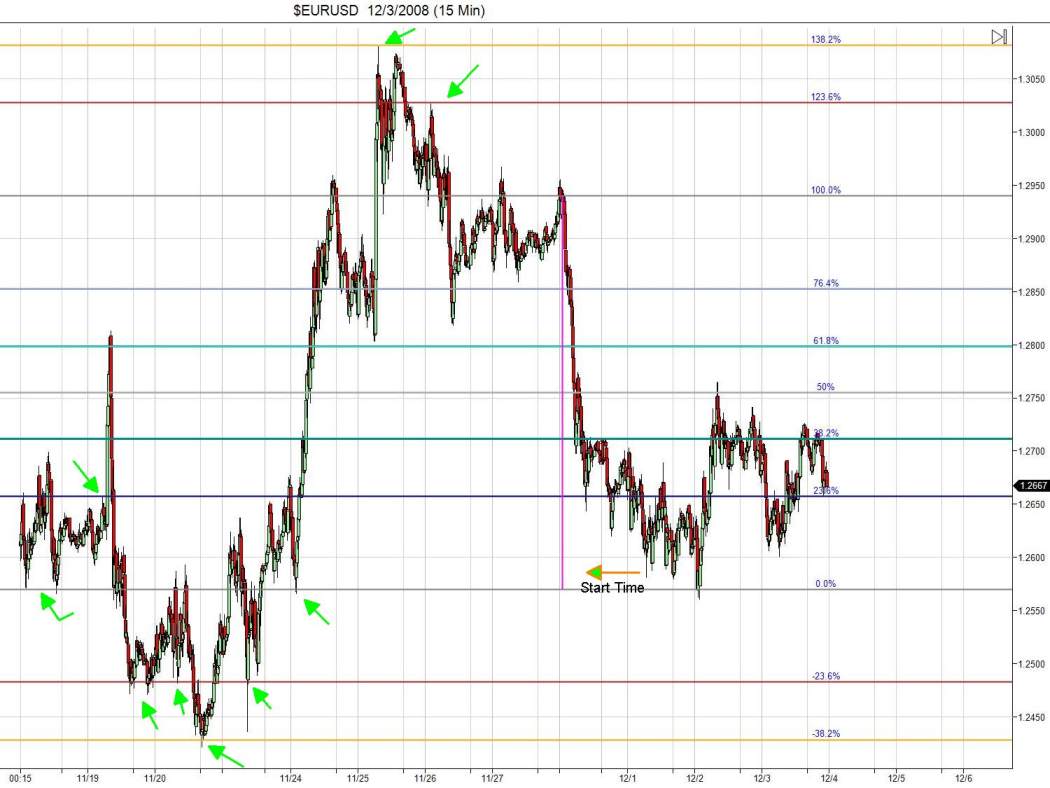 I think the second screenshot (FibLines) is particularly interesting because as you can see by the arrows I drew, the same Fibonacci levels are valid over a long time period, and the added levels above 100 and below 0 make picking the optimum start time less important.