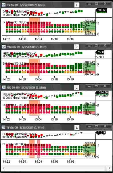Ok I wanted to try this but not on bar close. If bar close = false there will be bad signals, both red and green on same candle etc. Here is the indicator modified to allow selecting standard Dots to be Plotted instead of Arrows Drawn, which simplifies things greatly and allows updates per tick. This will overwrite the old indicator. Here is also a pic showing where I'm experimenting to see major markets bias. The candles are hardly visible but really don't even need to be seen.Last edited by eDanny; 03-25-2009, 02:13 PM.