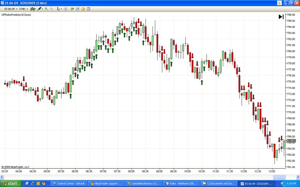 I created this indicator with artificial intelligence. I trained it in 5-minutes ES data, so it would be more effective with those settings. However, I have tried with other settings/data and seems to work. It displays red-down arrows when it "thinks" the trend will continue in the downwards direction, green arrows otherwise. It displays nothing if it is not clear. Have fun!Last edited by lgarcia3; 03-22-2009, 08:41 PM.Tags: None