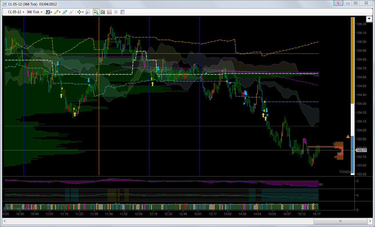 @cclsysOriginally posted by cclsys View PostThis pic of crude has vertical lines drawn on main chart at points where the oscillator has clearly changed trend. Of note: several times the oscillator 'signaled' just a bar or three ahead of the price breaking out of the Ichi Clouds which often signifies a significant break out level. Anyway...