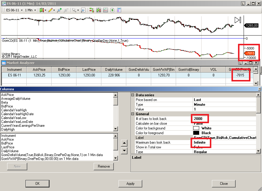 To have good sync between the GomCD on the chart and the GomCD on the market analyzer, they must have the same starting reference, so you must set reinit session to true on both, but the market analyzer has to be able to go far enough back in the bars so it can find the start of the session.
