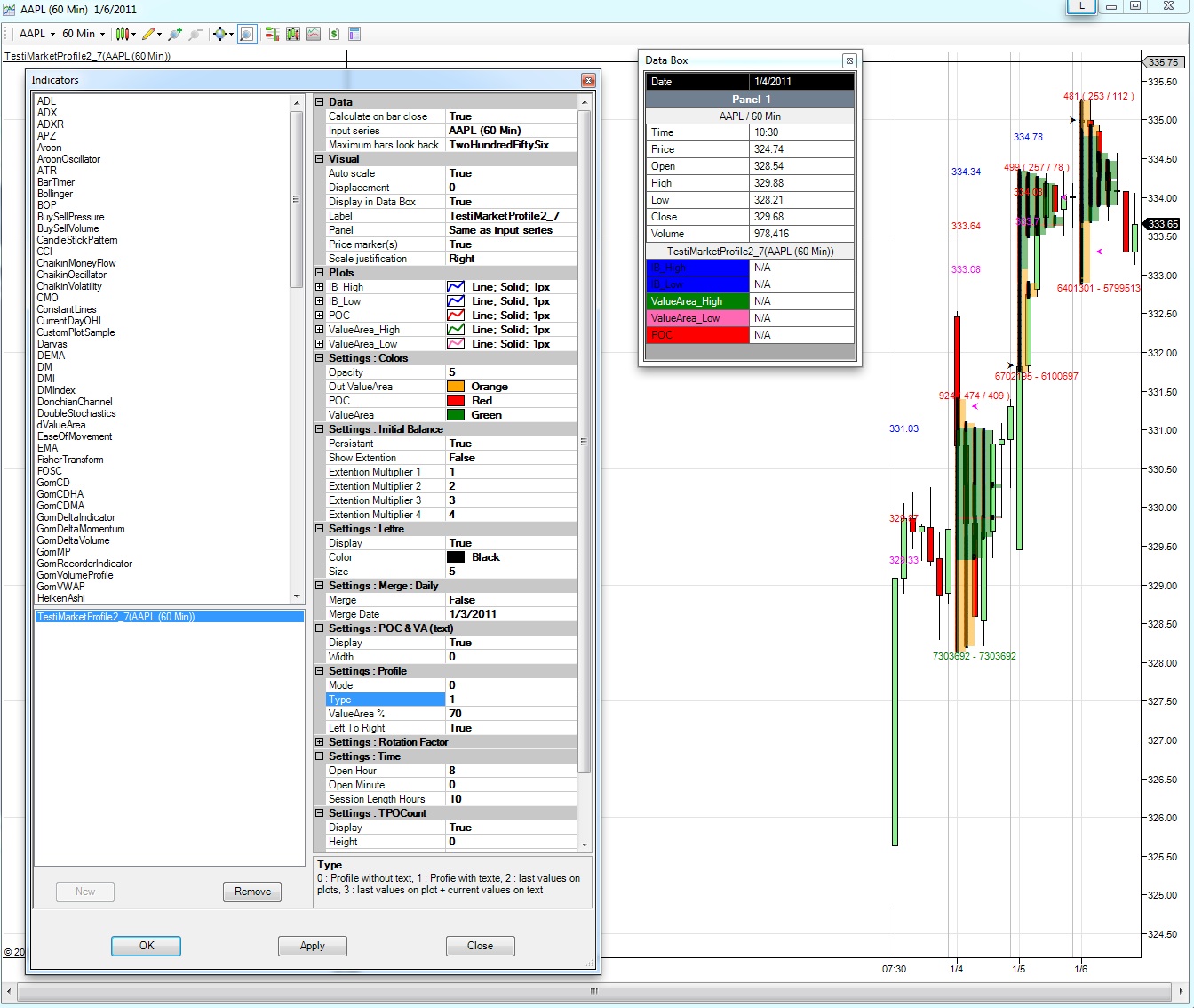 TYPE = 1. It shows the VAH, VAL and POC as text and profile painted with colors. TYPE = 2 and 3, it draws lines across for VAH, VAL & POC with text but now doesn't paint the profile with colors and is lost visually.