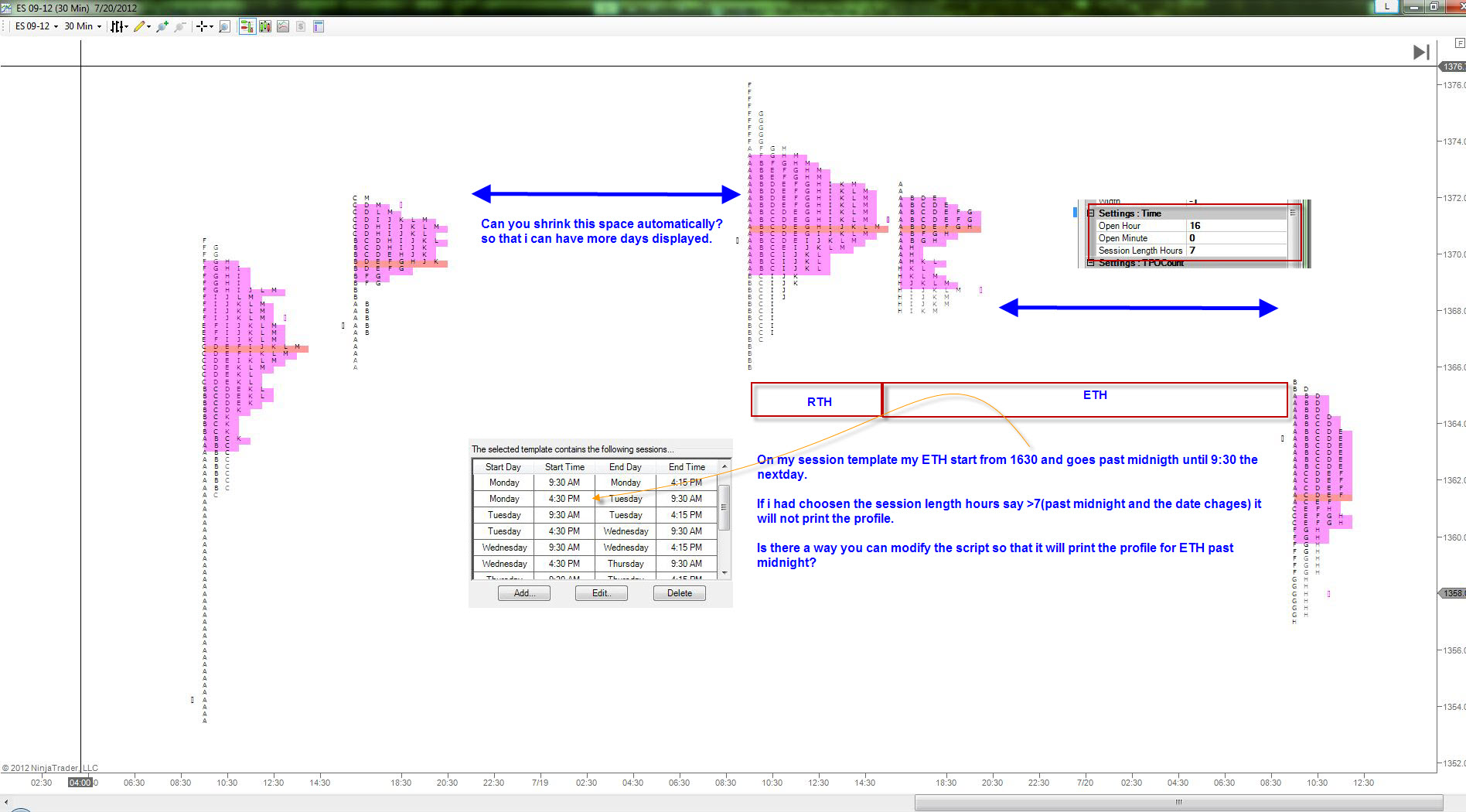 2). Under time setting if had selected "the session length hours" to go beyond midnight it wont plot the profile. Is there any way you can get this fixed? Ideally i would like to get one RTH profile and ETH profile which covers from 16:30 through next day 9:30 AM for ES.