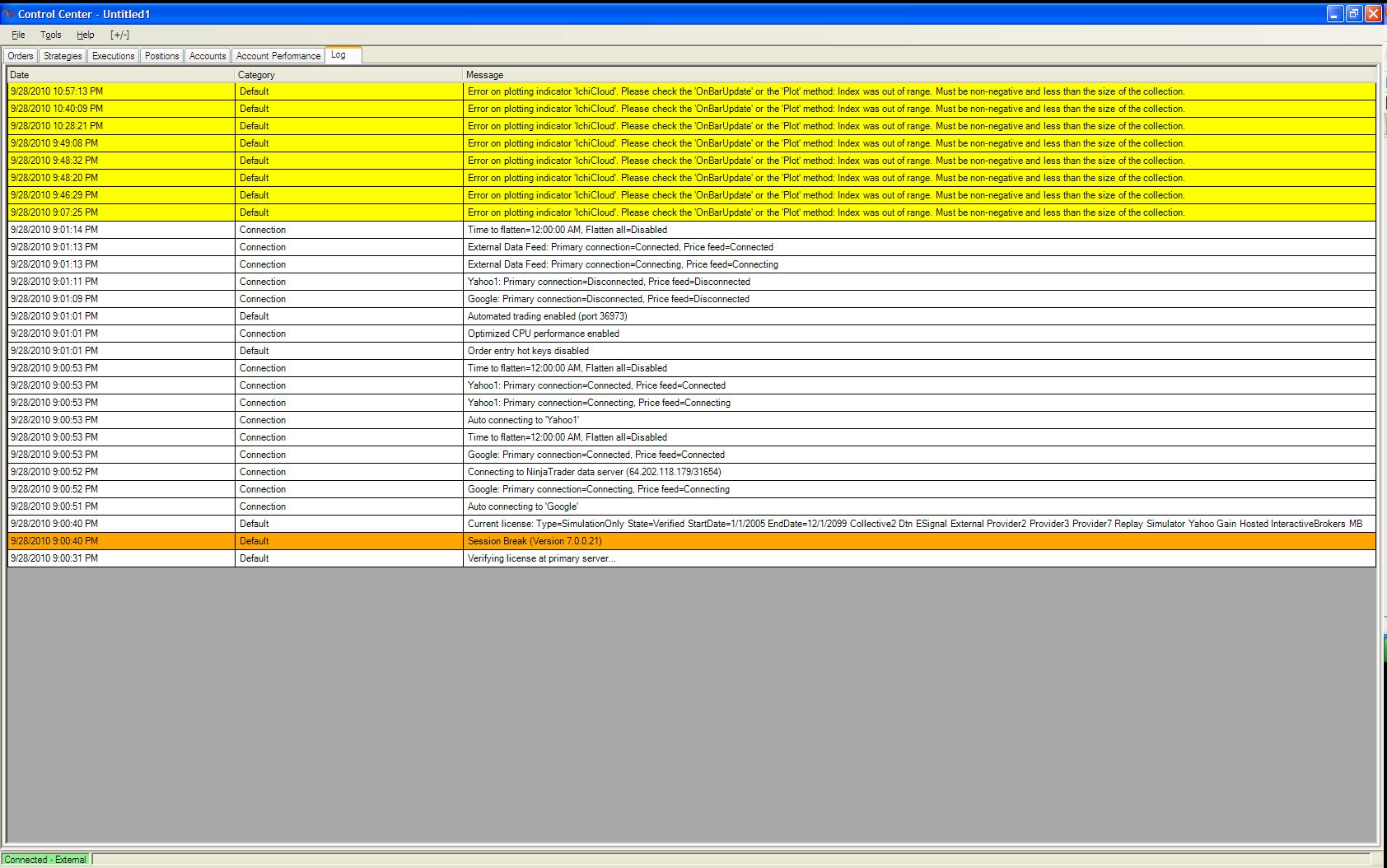 Using NT7 & Uploaded the Ichimoku2 indicator from this forum (thanks for the upload!). I'm setting the IchiCloud displacement to 26 (as it should be). The cloud appears initially, however, after scrolling the chart towards the left to see earlier bars, the cloud magically disappears. The following message appears in the log.