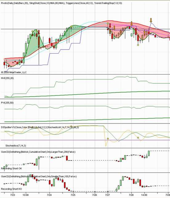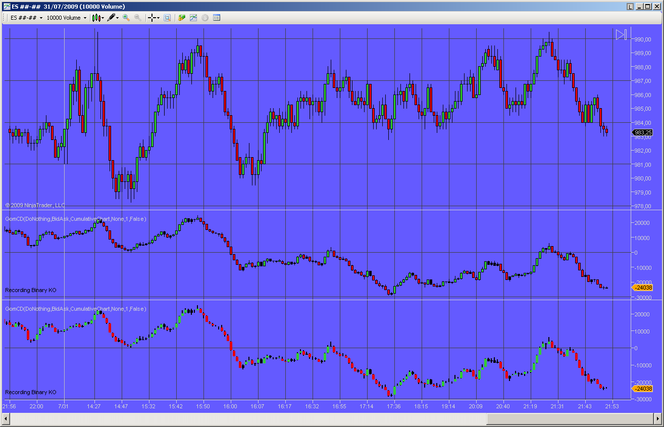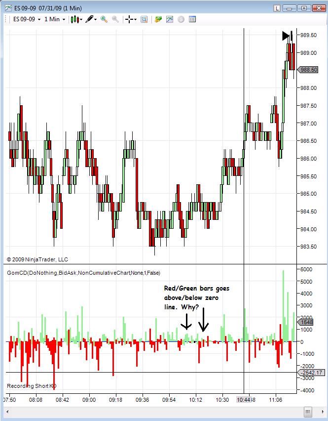 (1) I took screen shots of the FDT's TradedVolume from above video for July 31 ES charts, as well as ES GomCD 1-min NonCumulative chart. It looks different from your NonCumulative chart. I wonder why GomCD plot green bars below zero line, or red bars above zero line? Also, FDT's TradedVolume indicator seems much smoother, show divergence clearly. Any idea why?