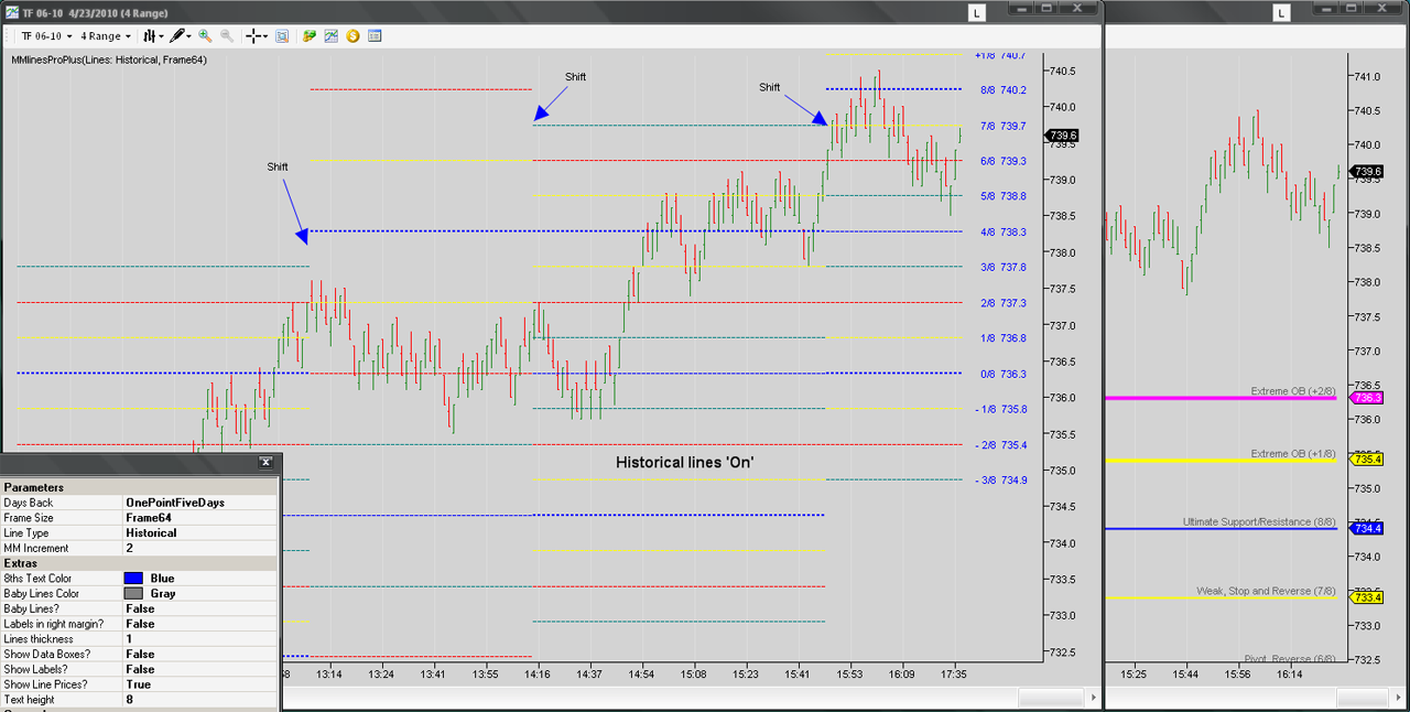I have notice NT remains the same no matter if the range widens in the day session.....it does have something to do with range and your session begin and ending times - - I know this because I changed my SESSION hours within chart properties and the entire MM re-calc'd the 1/8's.