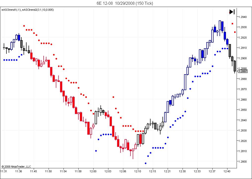 Hi eDanny: I downloaded 'EASCtrend1changed.zip' and imported it into NT. I get the color candles (red, blue and green) and the message "Trend UP" but I don't have the trailing stop dots nor the big Red or Blue Dots to indicate entry long or short, characteristic of eASCTrend. Is your original post in another thread? Maybe this happens because is after market hrs?Originally posted by eDanny View PostOops, not so fast, just realized there should be a neutral bar color. Fixed that and added a trend text box in lower corner. Just eye candy and can be turned off. You can re-download the newer version in my original post.