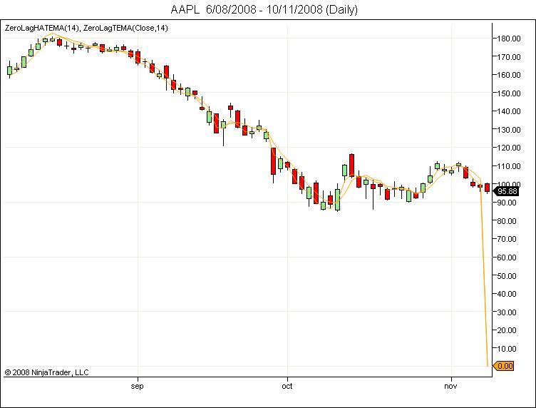 I have just revisited the ZeroLagHATEMA, which was coded as a supplement to TASC magazine from May 2008. I used it with a longer period and it caused considerable trouble, as it took about 5,000 to 10,000 bars to display correct values. The reason is a bug: