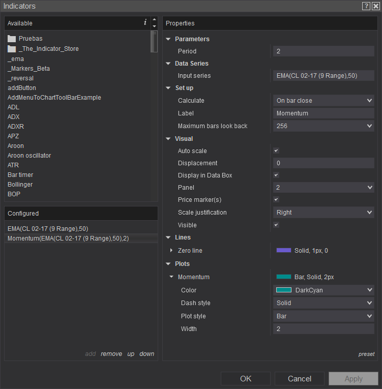 * Right click you chart > indicators > Select the Indicator from the list on the left > New > OK