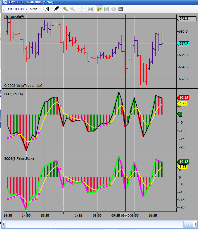 I don't like a lot of indicators on my chart, and this is an attempt at mapping the important info from the ECO indicator onto the price panel.