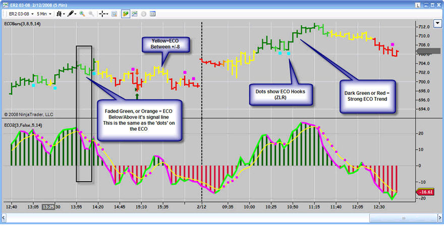 That is ...[LIST=1][*]Green = Strong Long ECO, Above Zero, Above it's signal line, and over a minimum 'chop' threshold[*]FadedGreen = Weakening Long ECO, Above Zero, BELOW it's signal line, and over a minimum 'chop' threshold[*]Red = Strong Short ECO, Below Zero, Below it's signal line and a minimum 'chop' threshold[*]FadedGreen = Strong Short ECO, Below Zero, ABOVE it's signal line and a minimum 'chop' threshold[*]Yellow = Chop ... ECO between the chop threshold (default =/-8 .. can be tuned)[/LIST]