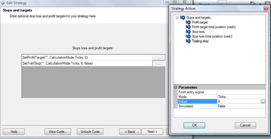 Check attached, In Strategy Wizard I want to use TrailingStop feature but I donot understand how to enter the settings required for trailing stop. I want that stop should be trailed when i get 4 ticks in profit. I tried to get help files on this topic but could not found any thing or examples..