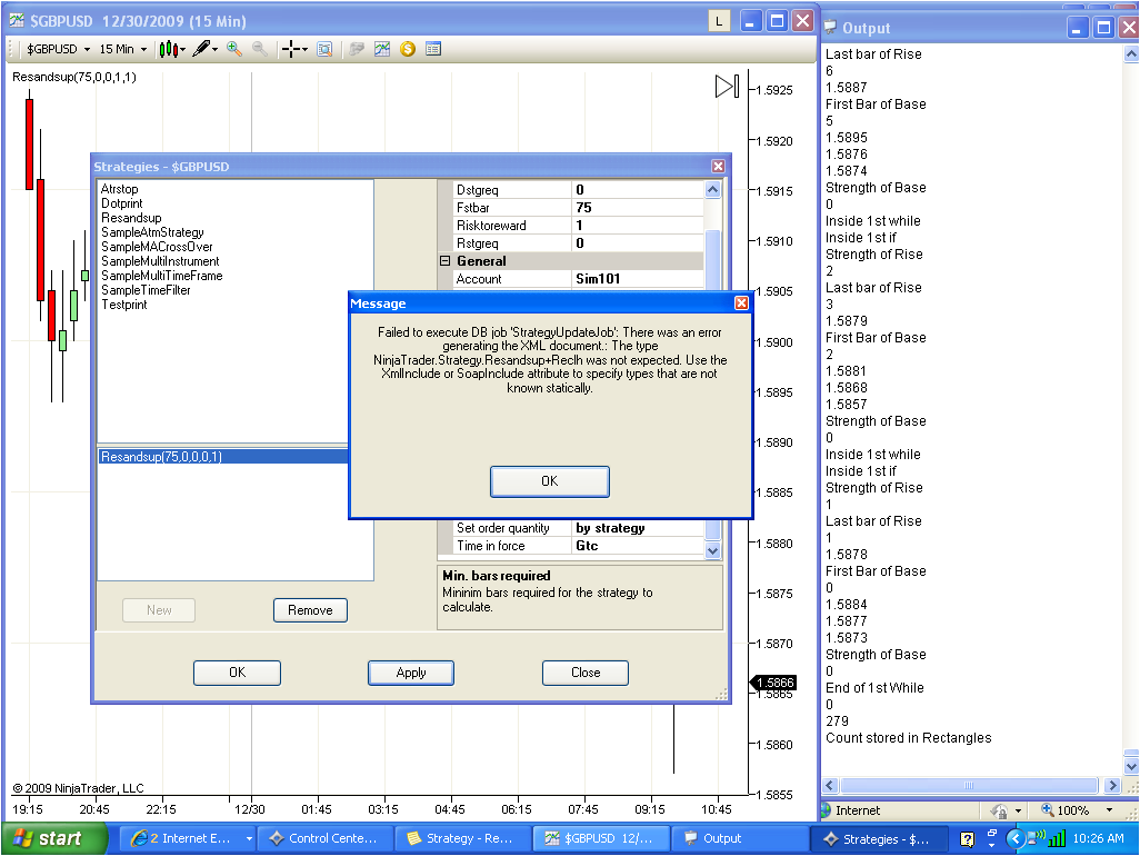 “ Failed to execute DB job “StrategyUpdateJob”: There was an error generating the XML document: The type NinjaTrader.Strategy.Resandsup+Reclh was not expected. Use the XmlInclude or SoapInclude attribute to specify types that are not known statically.”