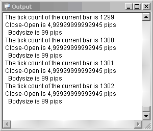 Print("  Bodysize is " + BodySize.ToString() + " pips");