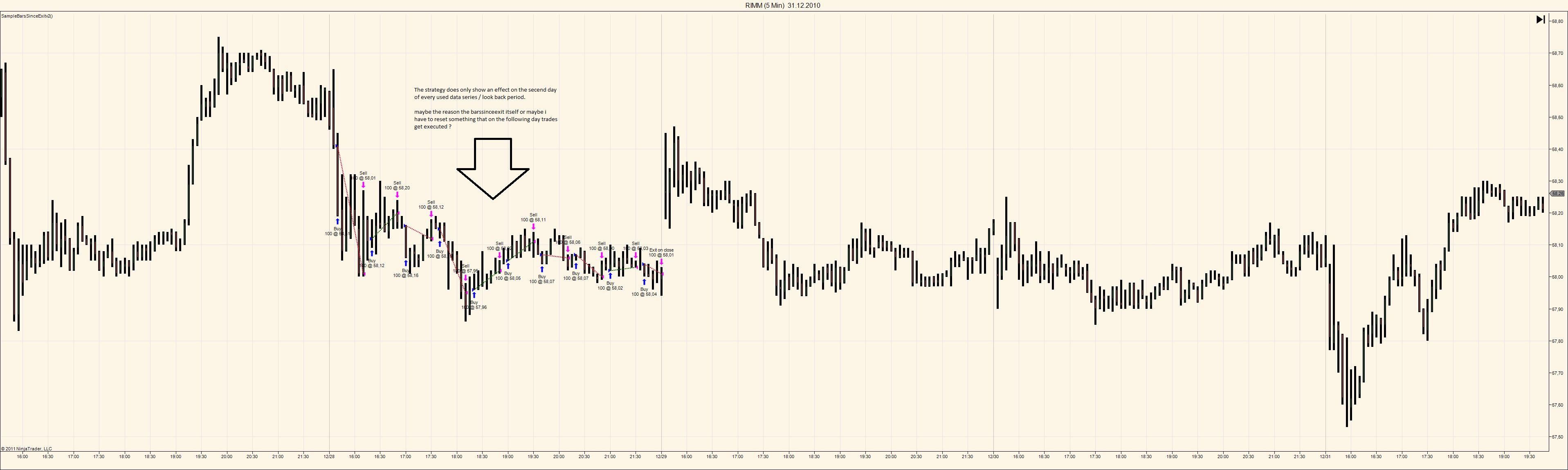 thank you for your fast answer. Its less the result of the strategy but more the point that it only shows an effect on one day. I attached a picture and the simple code file for the problem. I dont know what i have to do, that it makes/shows the trades each day.