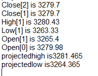 [FONT=Courier New][SIZE=2][COLOR=#0000ff][FONT=Courier New][SIZE=2][COLOR=#0000ff][FONT=Courier New][SIZE=2][COLOR=#0000ff] double[/COLOR][/SIZE][/FONT][/COLOR][/SIZE][/FONT][/COLOR][/SIZE][/FONT][FONT=Courier New][SIZE=2][FONT=Courier New][SIZE=2][COLOR=#000000] C2A = PriorDayOHLC().PriorClose[[/COLOR][/SIZE][/FONT][/SIZE][/FONT][FONT=Courier New][SIZE=2][COLOR=#800080][FONT=Courier New][SIZE=2][COLOR=#800080][FONT=Courier New][SIZE=2][COLOR=#800080]2[/COLOR][/SIZE][/FONT][/COLOR][/SIZE][/FONT][/COLOR][/SIZE][/FONT][FONT=Courier New][SIZE=2][FONT=Courier New][SIZE=2][COLOR=#000000]];[/COLOR] Print([/SIZE][/FONT][/SIZE][/FONT][FONT=Courier New][SIZE=2][COLOR=#800000][FONT=Courier New][SIZE=2][COLOR=#800000][FONT=Courier New][SIZE=2][COLOR=#800000]"Close[2] is "[/COLOR][/SIZE][/FONT][/COLOR][/SIZE][/FONT][/COLOR][/SIZE][/FONT][FONT=Courier New][SIZE=2][FONT=Courier New][SIZE=2] + PriorDayOHLC().PriorClose[[/SIZE][/FONT][/SIZE][/FONT][FONT=Courier New][SIZE=2][COLOR=#800080][FONT=Courier New][SIZE=2][COLOR=#800080][FONT=Courier New][SIZE=2][COLOR=#800080]2[/COLOR][/SIZE][/FONT][/COLOR][/SIZE][/FONT][/COLOR][/SIZE][/FONT][FONT=Courier New][SIZE=2][FONT=Courier New][SIZE=2]].ToString()); [/SIZE][/FONT][/SIZE][/FONT][FONT=Courier New][SIZE=2][COLOR=#0000ff][FONT=Courier New][SIZE=2][COLOR=#0000ff][FONT=Courier New][SIZE=2][COLOR=#0000ff]double[/COLOR][/SIZE][/FONT][/COLOR][/SIZE][/FONT][/COLOR][/SIZE][/FONT][FONT=Courier New][SIZE=2][FONT=Courier New][SIZE=2] C1A = PriorDayOHLC().PriorClose[[/SIZE][/FONT][/SIZE][/FONT][FONT=Courier New][SIZE=2][COLOR=#800080][FONT=Courier New][SIZE=2][COLOR=#800080][FONT=Courier New][SIZE=2][COLOR=#800080]1[/COLOR][/SIZE][/FONT][/COLOR][/SIZE][/FONT][/COLOR][/SIZE][/FONT][FONT=Courier New][SIZE=2][FONT=Courier New][SIZE=2]]; Print([/SIZE][/FONT][/SIZE][/FONT][FONT=Courier New][SIZE=2][COLOR=#800000][FONT=Courier New][SIZE=2][COLOR=#800000][FONT=Courier New][SIZE=2][COLOR=#800000]"Close[1] is "[/COLOR][/SIZE][/FONT][/COLOR][/SIZE][/FONT][/COLOR][/SIZE][/FONT][FONT=Courier New][SIZE=2][FONT=Courier New][SIZE=2] + PriorDayOHLC().PriorClose[[/SIZE][/FONT][/SIZE][/FONT][FONT=Courier New][SIZE=2][COLOR=#800080][FONT=Courier New][SIZE=2][COLOR=#800080][FONT=Courier New][SIZE=2][COLOR=#800080]1[/COLOR][/SIZE][/FONT][/COLOR][/SIZE][/FONT][/COLOR][/SIZE][/FONT][FONT=Courier New][SIZE=2][FONT=Courier New][SIZE=2]].ToString()); [/SIZE][/FONT][/SIZE][/FONT]