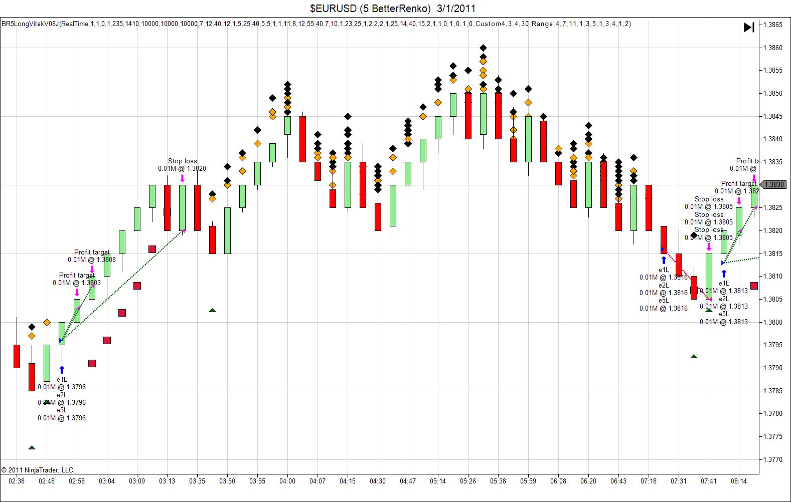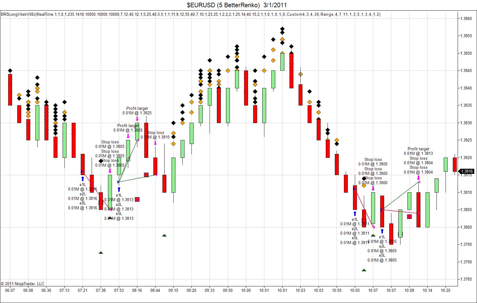Image from todays price action shows the black and orange diamonds from the BIP=1/2 and that the trade gets filled almost 4 hours after the initial order is put in to MBTrading.