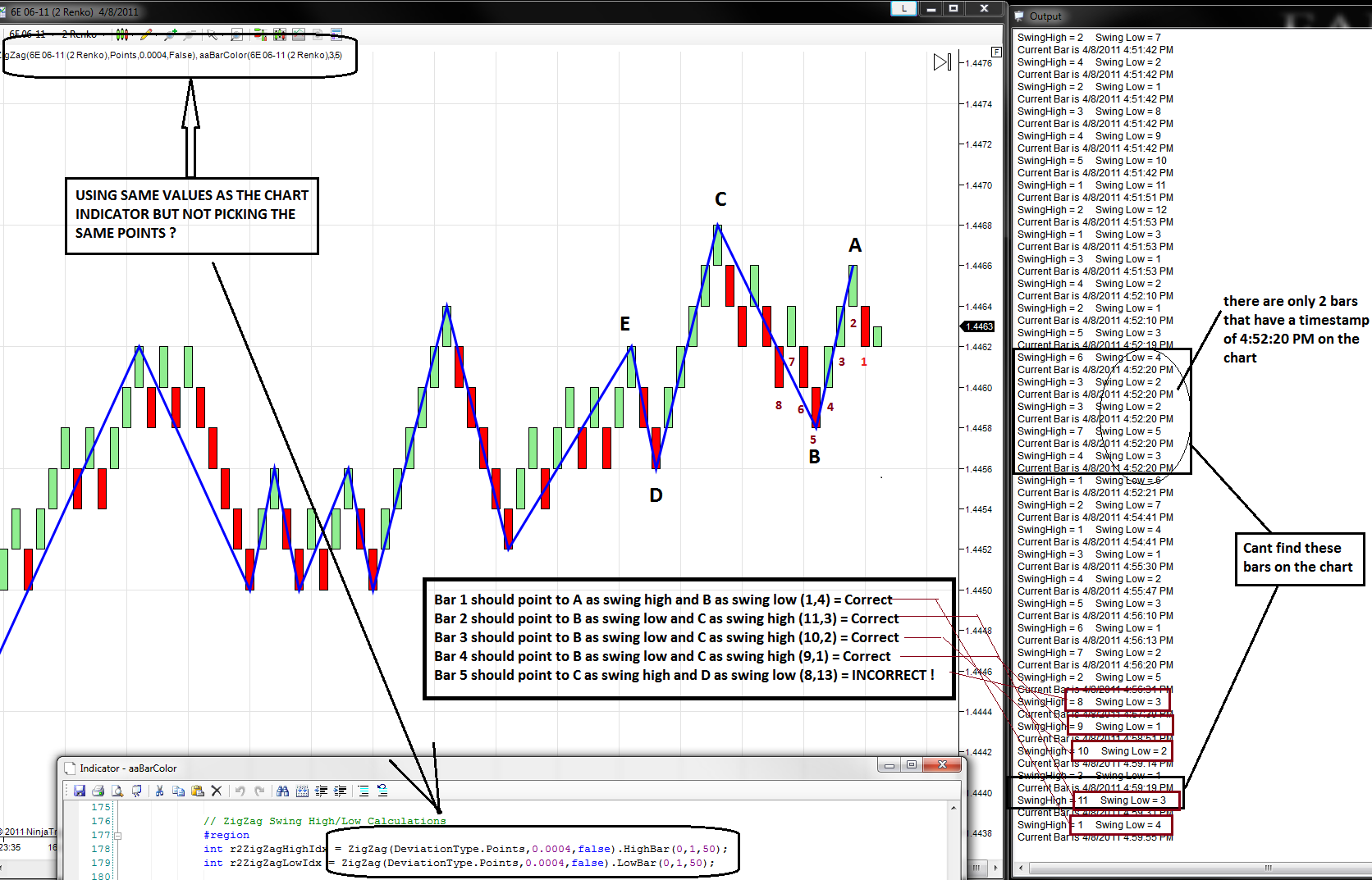 I'm trying to use the ZigZag in a custom script. When I overlay the indicator on the chart it seems to work fine and is catching the swing highs and lows that I'd like it to catch but when I use the indicator method in a custom script I'm getting very weird results (pls see attached)