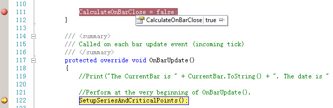 I set CalculateOnBarClose to false in Initialize(), However, when I set a break point in OnBarUpdate() and check the value of CalculateOnBarClos, it is still true.Please see attached picture for detail.Tags: None