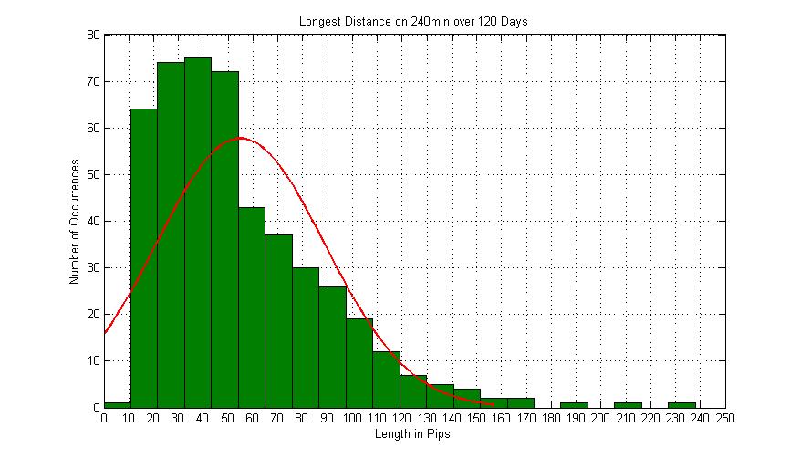 Using the Mode versus the mean is a possibility, wouldn't hurt to try it out. The frequency distribution, I just plotted that to get an initial idea of how all the data points where occuring. I.e. I can clear see in the first graph, the majority of the distances are less that 50 pips in distances. And in the second pic, I can see that most data fell between 10-110. These were done in matlab based on raw data exported from NT.