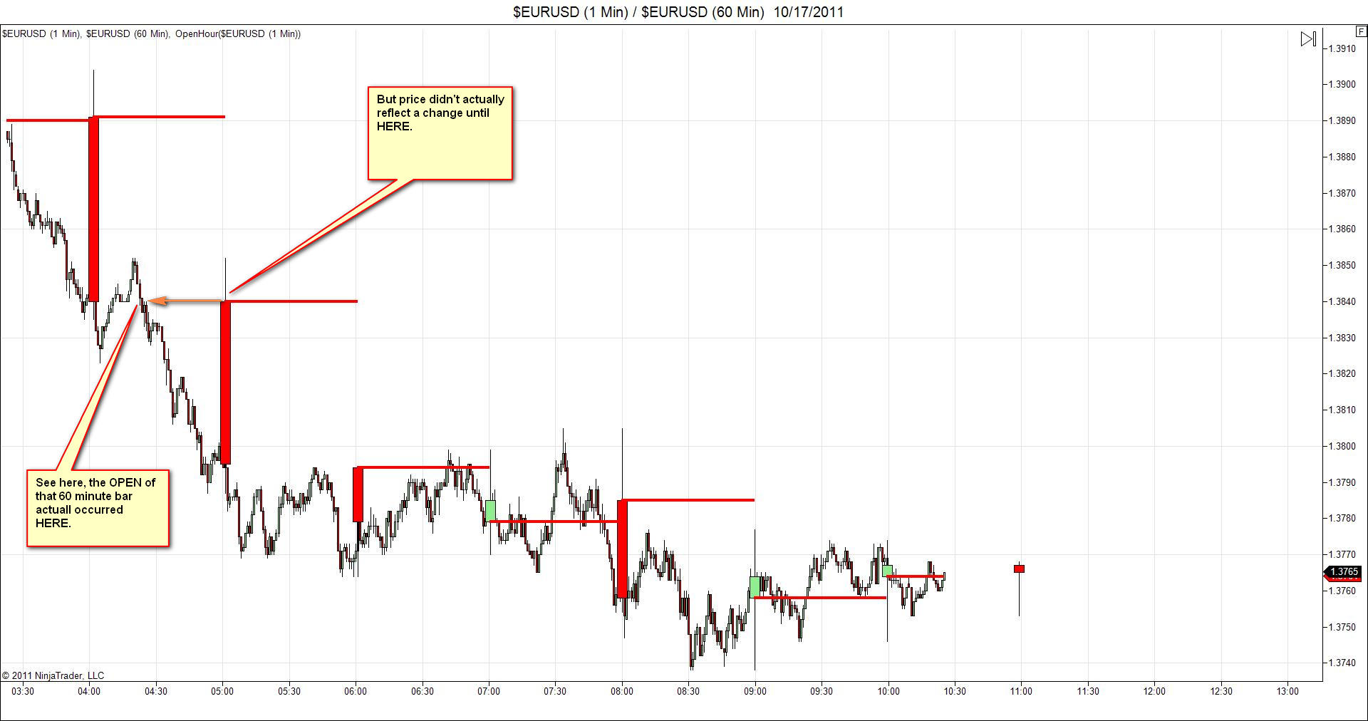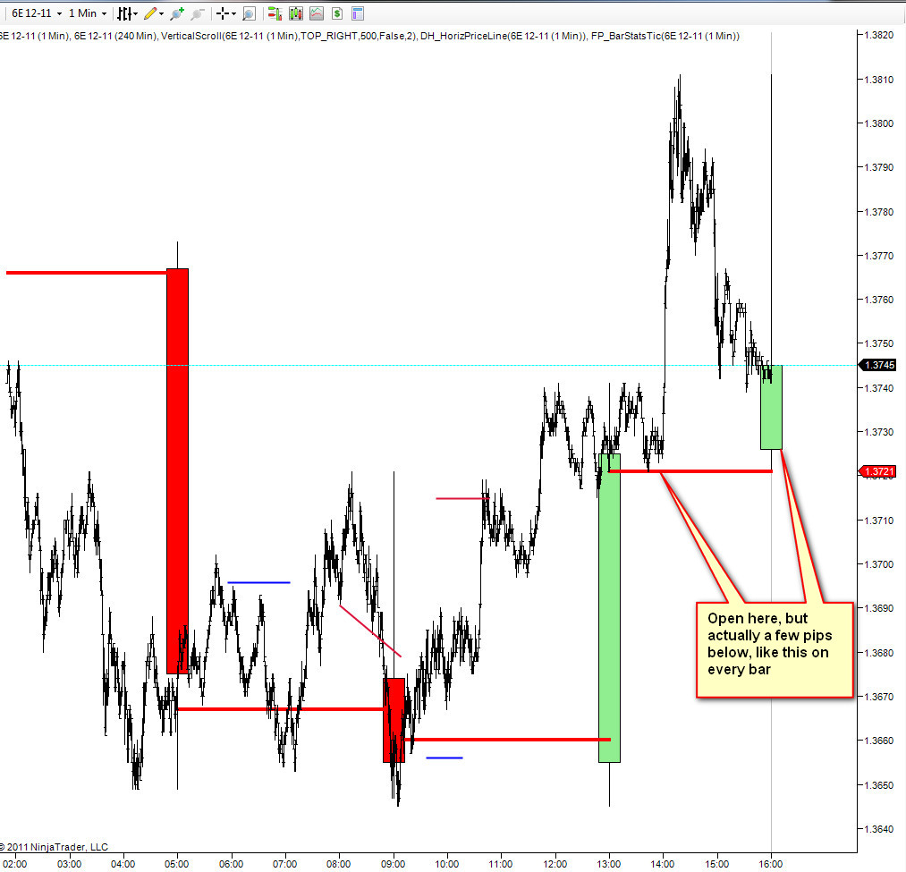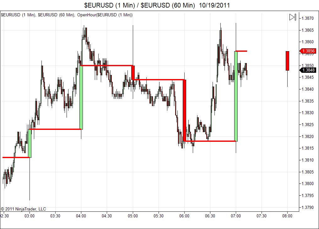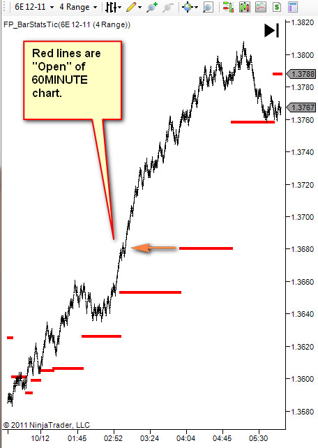 Then what I did, was take the Open from the 60 min dataSeries, and then plotted it on the chart to show that I am tracking it. You can see that in the pic below. The red horizontals lines show the Open from the secondary 60min chart.