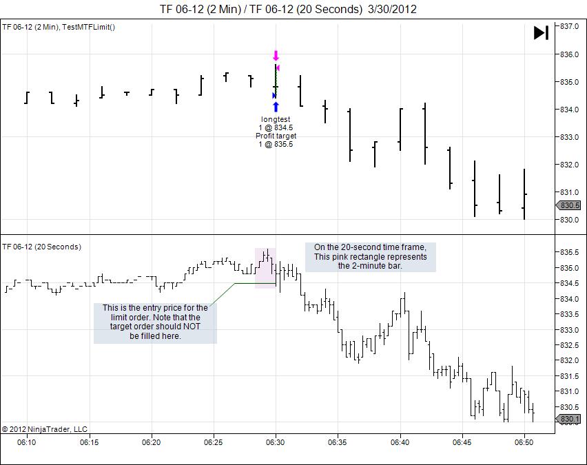 Update2: Now that I got it working on a secondary price series, unfortunately it doesn't solve the problem I reported in this thread. If the target price and entry price occur on the same bar, both will get filled even if the secondary time frame shows that the price passed through the target on its way to the entry -- which means the target should never get filled on that bar because the position hadn't been opened. This is a bug. This shouldn't be happening when backtesting on a finer granularity.