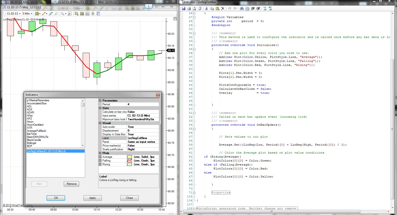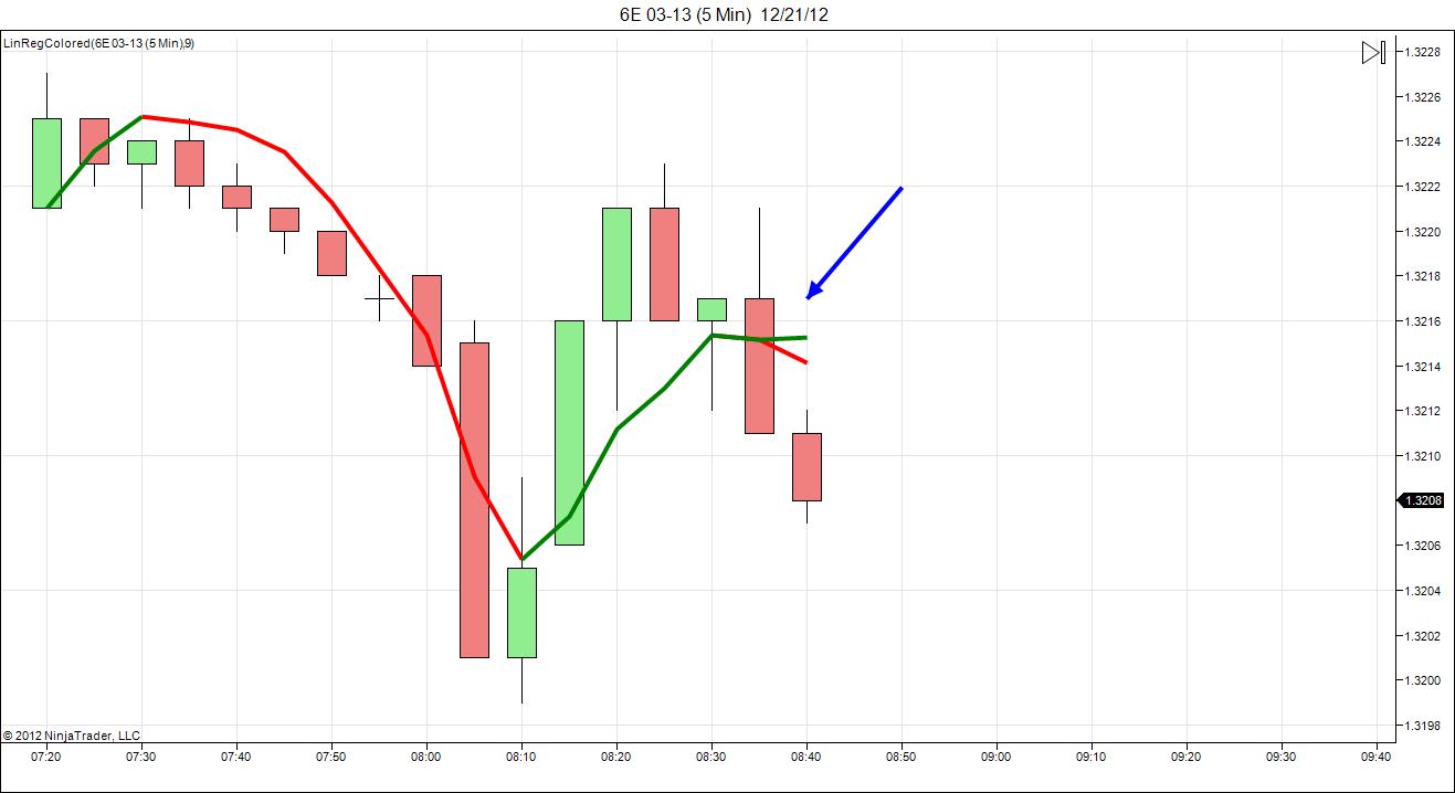 I now have a LinReg indicator which changes color depending on whether it is rising or falling. What I would like to fix in the code is the way it draws when it changes from rising to falling (and vice versa).