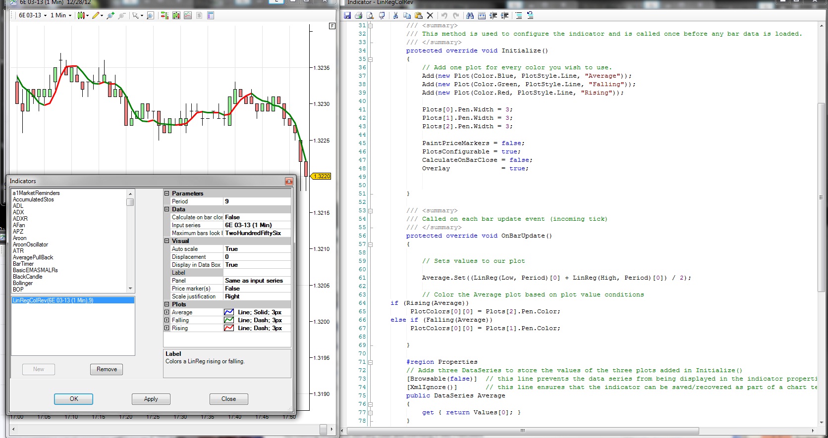 The last thing I need to resolve is how to code it so that I can adjust the colors of the plotted line (different for rising and falling) in the indicator menu box. Right now it does not do that though all three plots are listed nicely in the indicator menu box. I can adjust the width of the drawn line in the "Average line plot" as well as its dash style but I cannot change the colors. In the open box right now for example I chose yellow green as the color when it is rising, but it remains "green".