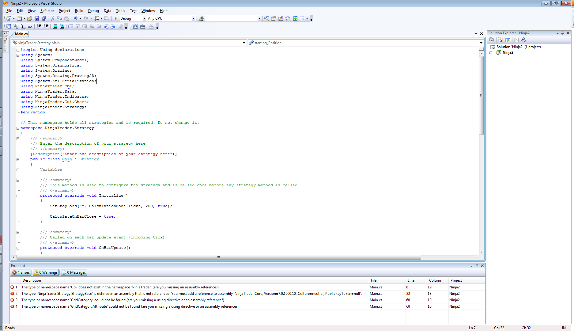I'm kinda new to NT programming. The first thing i tried was editing my new simple strategy with VS2008.