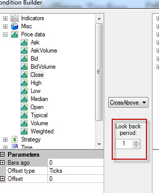 Attached is a screenshot of the Condition Builder. When you select CrossAbove or Below you will see a LookBack Period, this is the number of bars to check for the cross condition.