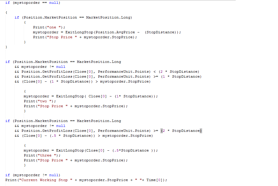 Hi fiddy, for the time when the stop seems ignored, what TraceOrders print would you see? That's usually the best way to start debugging such scenarios alongside the Prints you already have implemented - http://www.ninjatrader.com/support/h...ub=TraceOrders