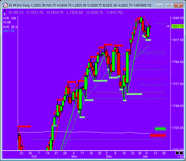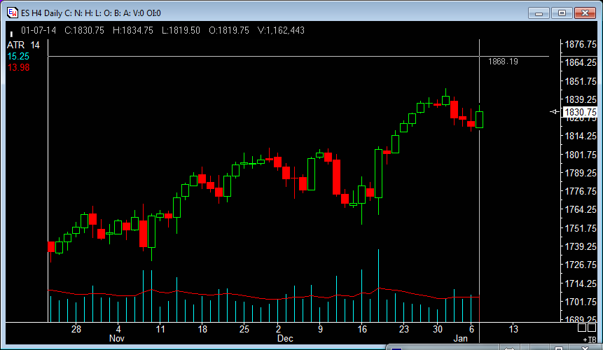 OK, here is ES H4. The bottom cyan is the daily ATR and the read line is the 14EMA. This only updates EOD, so in the data panel to the upper left the red number is ATR(14) as of yesterday. I can plot the ATR(14)SMA on top as well to see the differences if need be. Thanks for your help!Originally posted by Harry View PostWe cannot check the ATR, if you don't display it on your chart. Just one value in the upper left corner is not enough, but it is necessary to plot the ATR over the entire chart in a separate indicator panel.