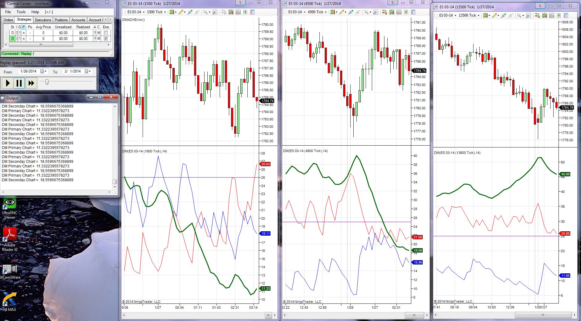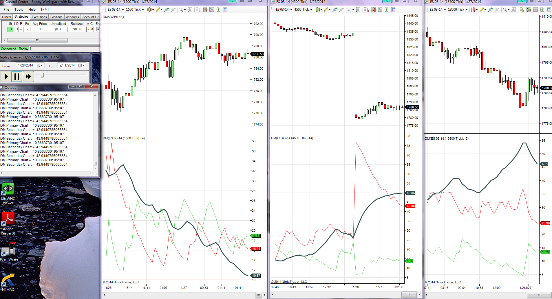 I have a 1500 tick bar chart as my primary chart. A 4500 tick bar chart is my secondary chart. I have the DM(14) indicator on both charts. While running market replay data for the ES contract the output values on the secondary chart do not correspond with indicator on the 4500 tick bar graph. Run the strategy below in the primary 1500 tick bar chart and observe the output window with secondary chart values. Please confirm they do not correspond. If so, why?