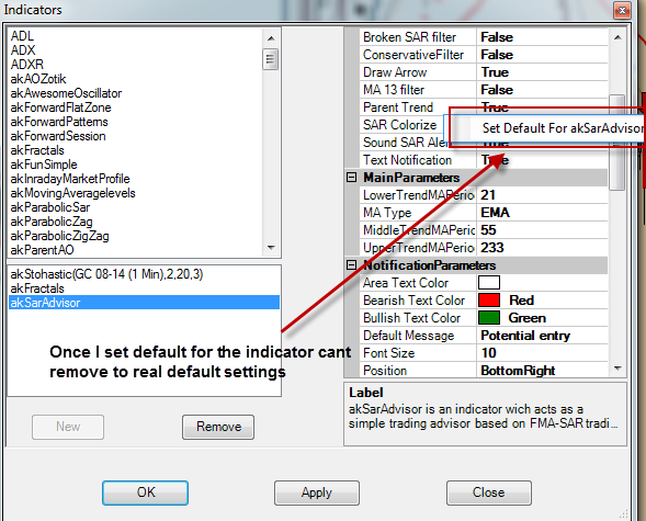 I set default settings for my custom indicator, do some coding changes and can't see difference because "default" for the indicator is the same.