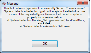 26/12/2017 2:34:54 p. m.|0|4|Unable to retrieve type infos from assembly 'Accord.Math': System.Reflection.ReflectionTypeLoadException: No se pueden cargar uno o varios tipos requeridos. Recupere la propiedad LoaderExceptions para obtener más información.